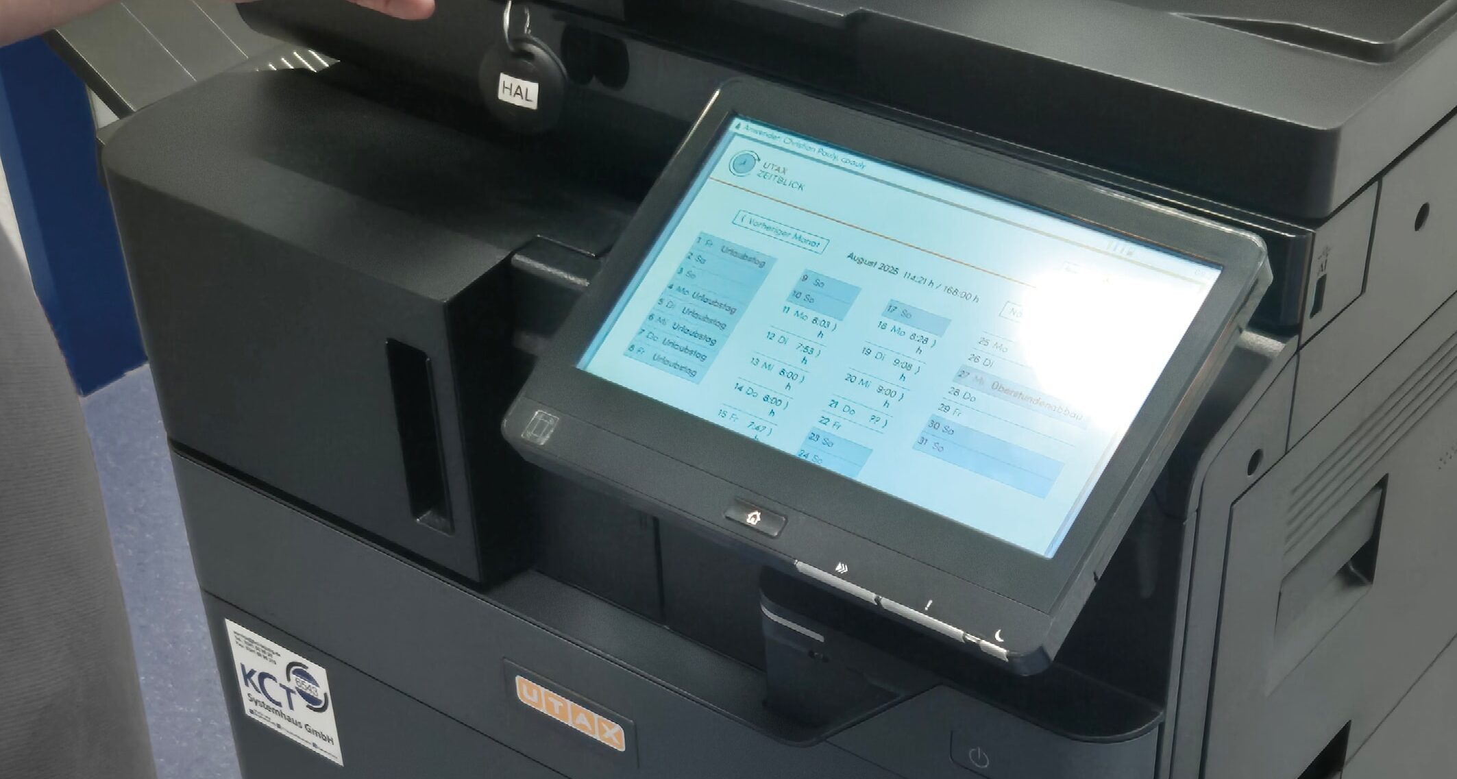 „Das Stempeln am MFP ist elegant, effizient und vor allem vertraut. Unsere Mitarbeiter nutzen die Multifunktionssysteme täglich“, berichtet Schrodke. „Dass die Geräte nun auch für die Arbeitszeiterfassung dienen, macht es allen leicht, die neue Methode in den Arbeitsalltag zu integrieren. Keine zusätzliche Technik, keine neue Karte, keine Einweisung – alles funktioniert mit dem bekannten Transponder, der bei uns ohnehin schon im Einsatz war.“